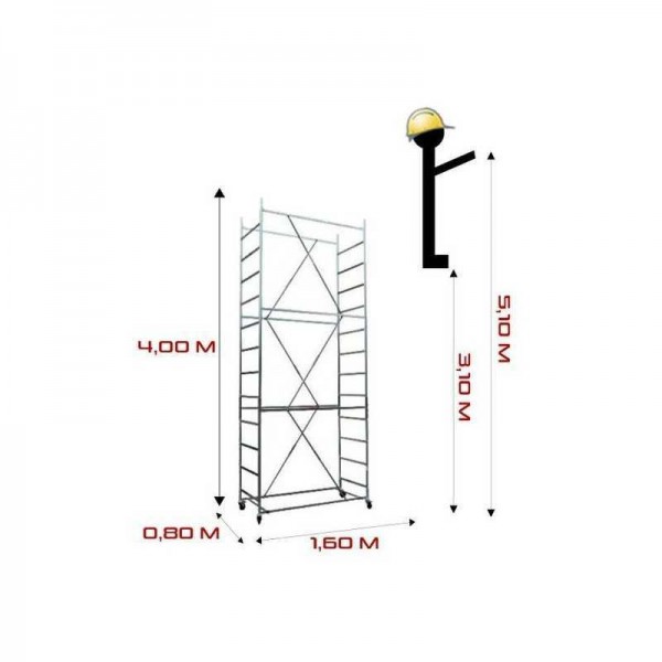 E’costruito interamente in ferro zincato ed ha una dimensione di ingombro base 1,60X0,78 mt con un’altezza massima di lavoro di 5 mt.