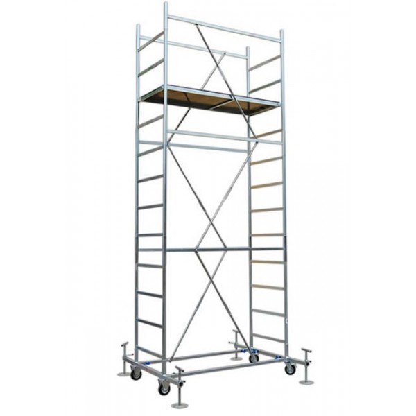 E’costruito interamente in acciaio zincato ed ha una dimensione di base (senza livellatori) 165X84 cm con un’altezza massima di lavoro di 6,20 mt.